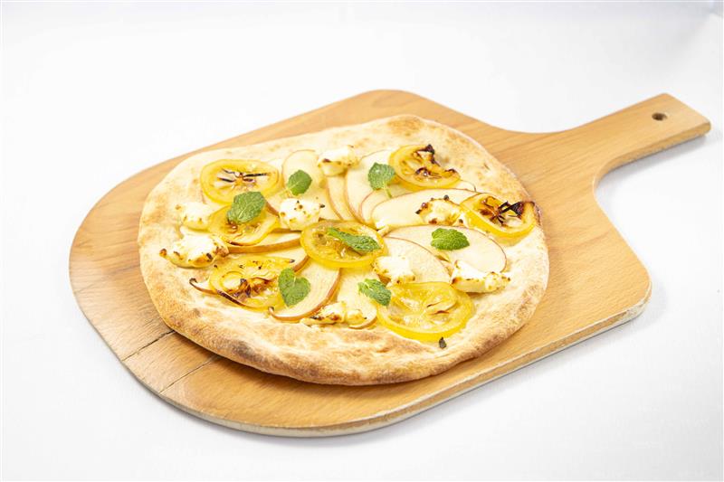 クリームチーズとリンゴにはちみつに漬けたレモンを焼成したピザです。