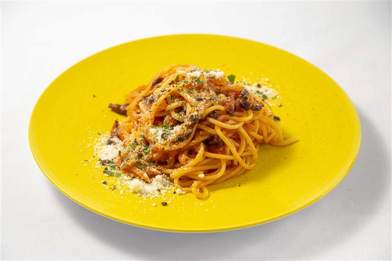 旨みが詰まったグアンチャーレにトマトソースと絡め、淡路島産の玉ねぎの甘さと合わさったパスタです。粉チーズが上からトッピングされチーズの香りが広がります。