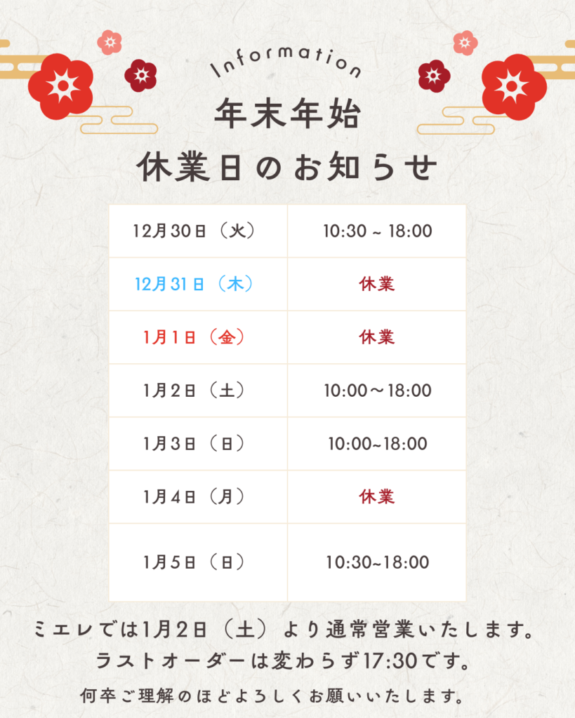 今年も一年、ミエレのカフェでお過ごしいただき、心より感謝申し上げます。