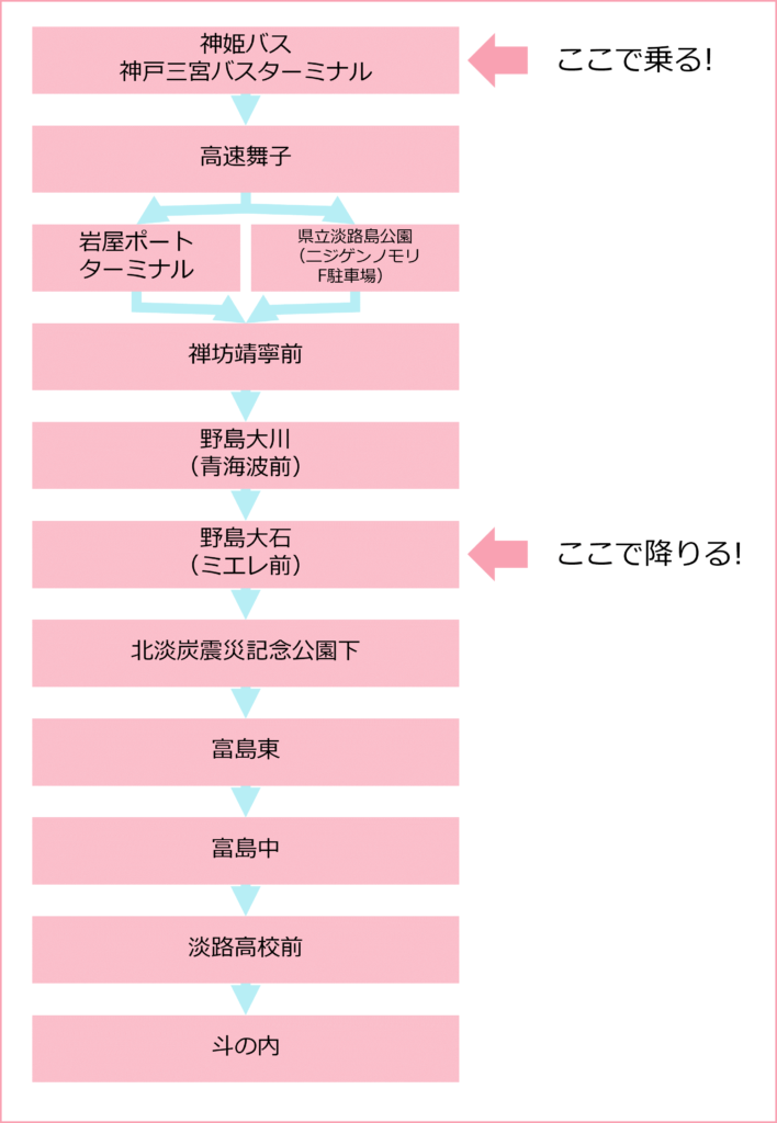 「野島大石(ミエレ前)」まで、淡路島の島内移動も含めると三宮からおおよそ1時間くらいでの到着となります。