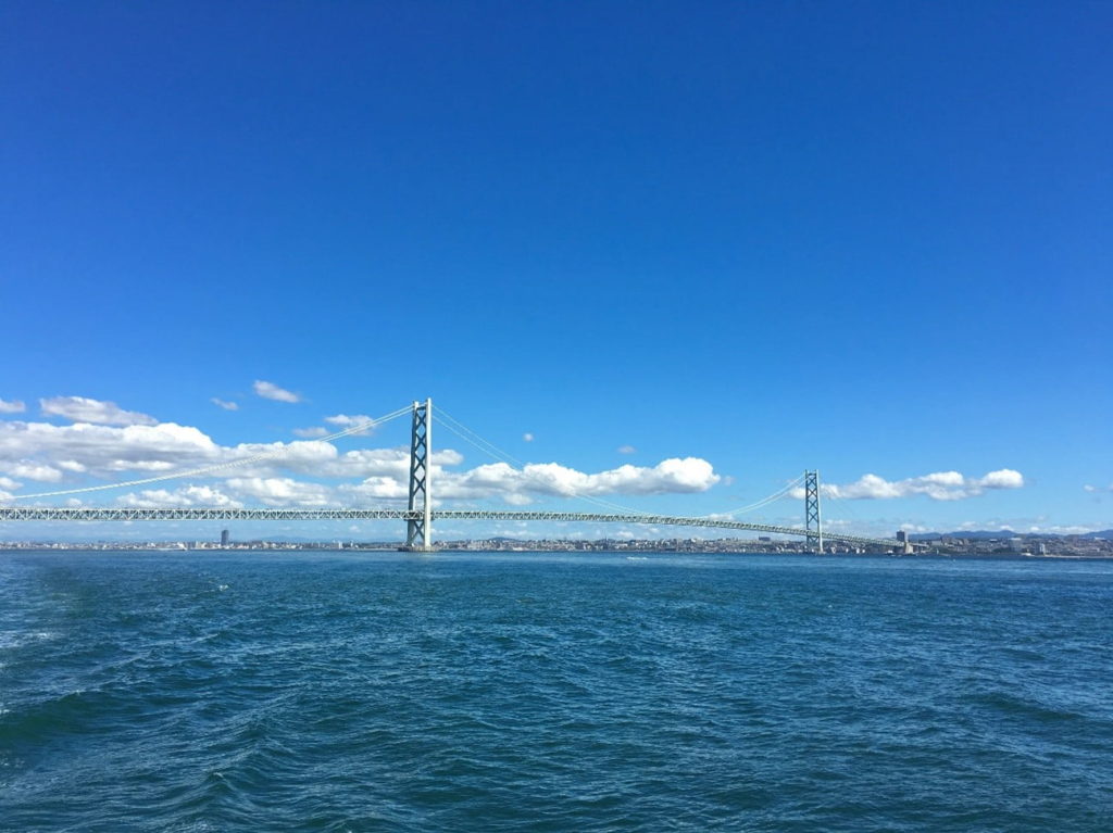 三宮を出発して40分ほどで見えてくるのは、迫力満点の「明石海峡大橋」。 おすすめは右側の座席!